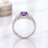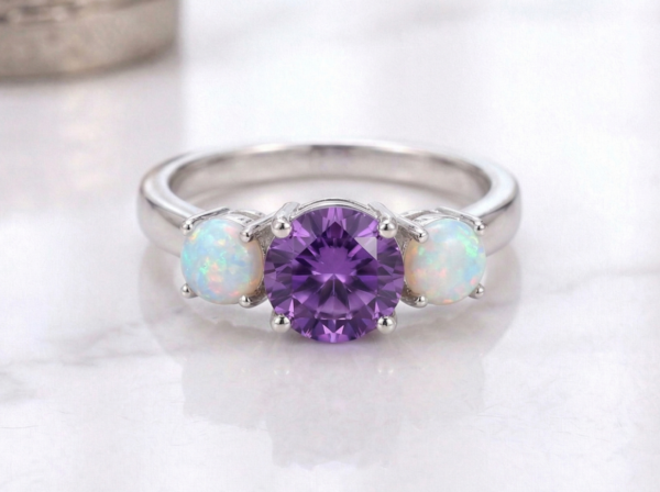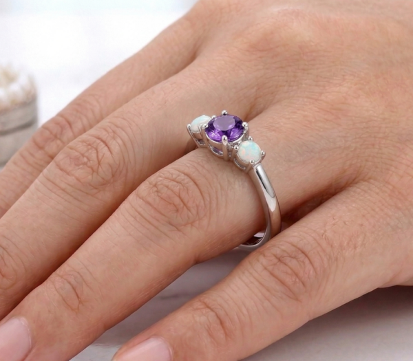 The center stone is a 6mm round Amethyst (approx. 1 carat), admired for its deep, vibrant purple color and clarity. It is accented by two 4mm round Opals (approx. 0.50 carats total), known for their captivating play-of-color and luminous sparkle.