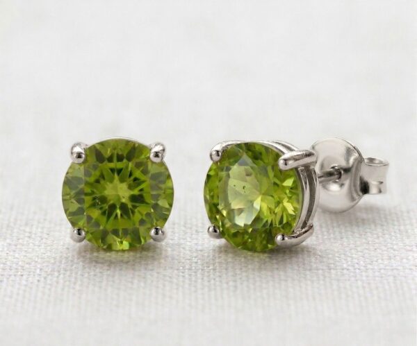 Each earring features a genuine round-cut Peridot gemstone, approximately 0.50 carats per stone (1 carat total). The stones display a lively, vibrant green color with a beautiful natural glow that adds a refreshing pop of color to any look.