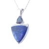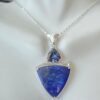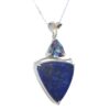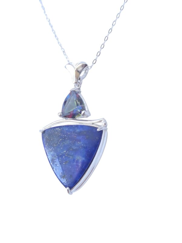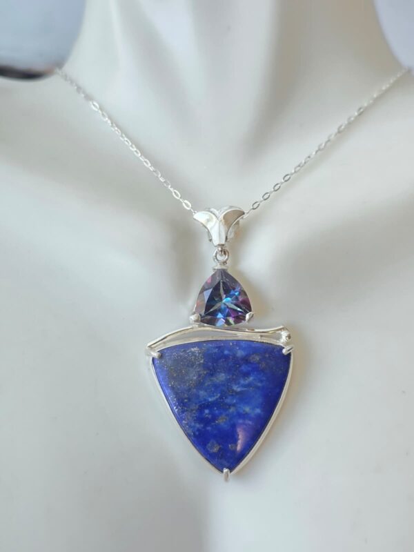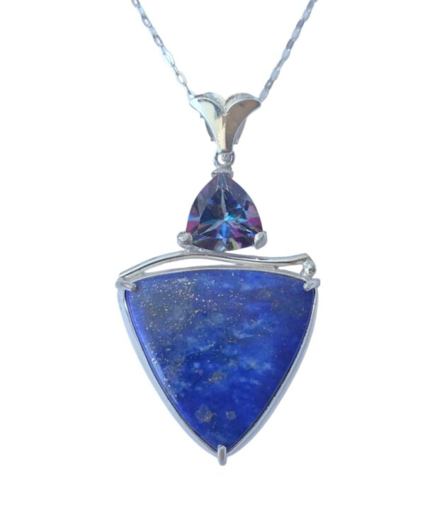 This unique handcrafted design features a captivating 10mm trillion-cut Blue Mystic Topaz, shimmering with iridescent flashes of deep ocean blues and subtle rainbow hues. Below, a dramatic trillion-cut Lapis gemstone—measuring approximately 1 inch in length—adds rich contrast with its deep royal blue tone and natural character.