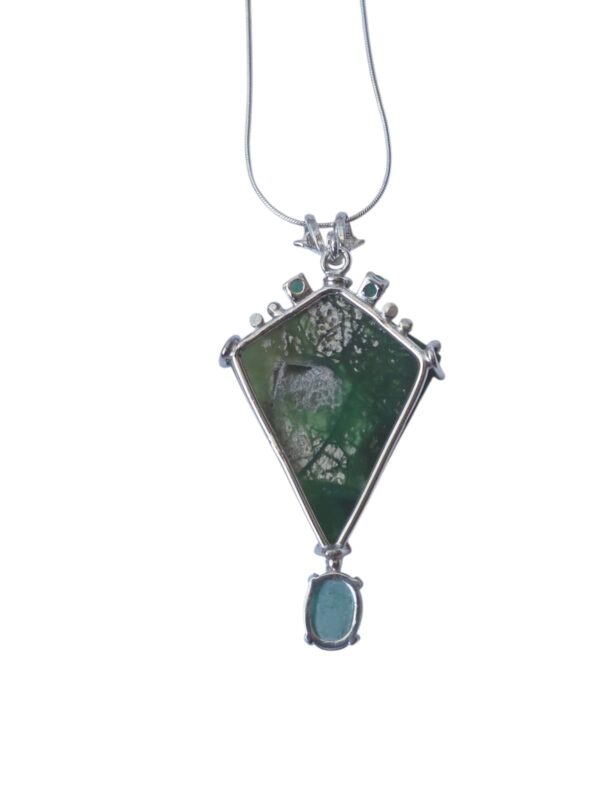 At the center of the design is a striking Variscite gemstone, cut in a distinctive kite shape and measuring approximately 1.25 inches. Its soft, earthy green tones and natural veining evoke serene landscapes, making it a calming and visually captivating focal point.