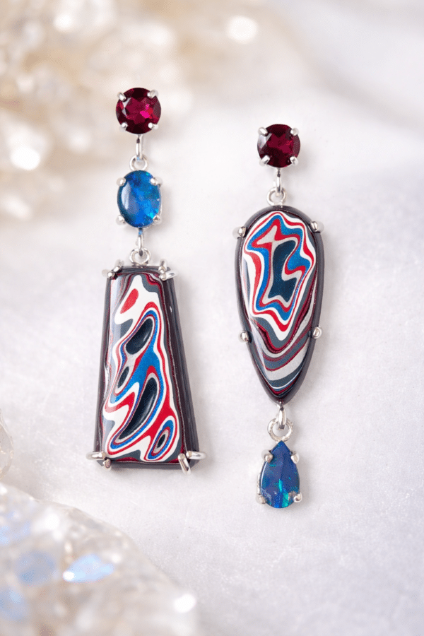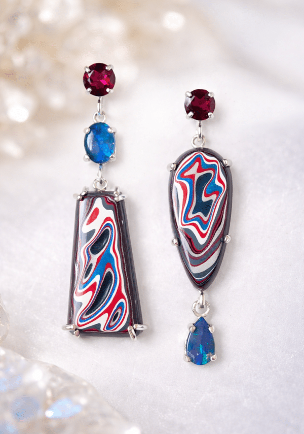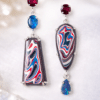 Each earring features a vibrant piece of Fordite—also known as “Detroit agate”—formed from layers of hardened automotive paint. The striking red, white, blue, and gray patterns create a completely unique, abstract design in every piece, making these earrings truly exclusive and impossible to replicate.