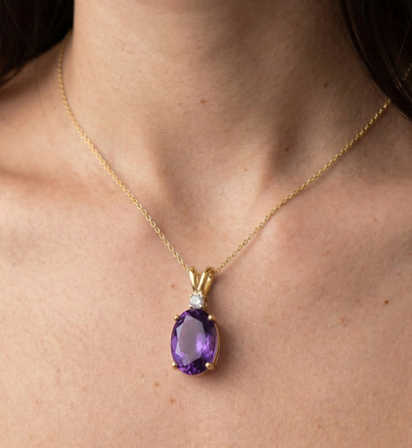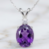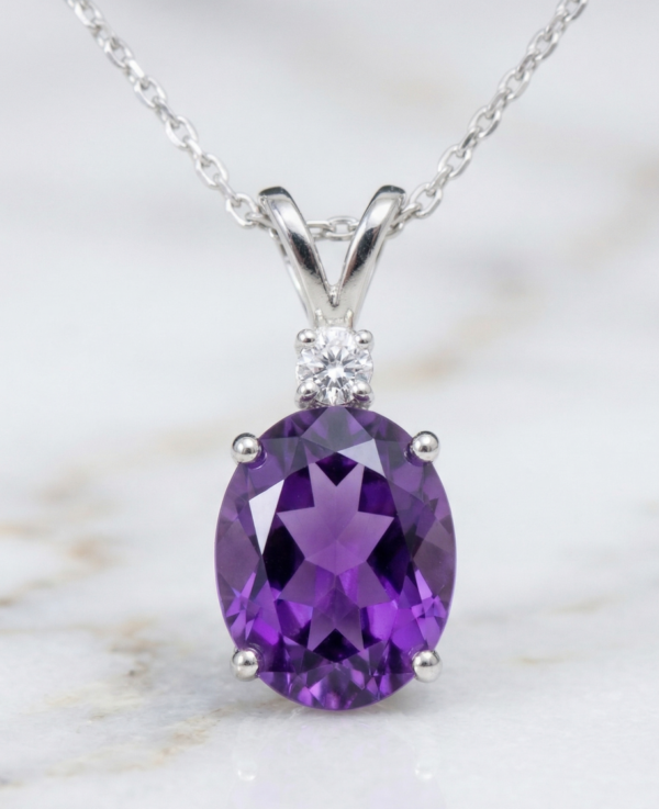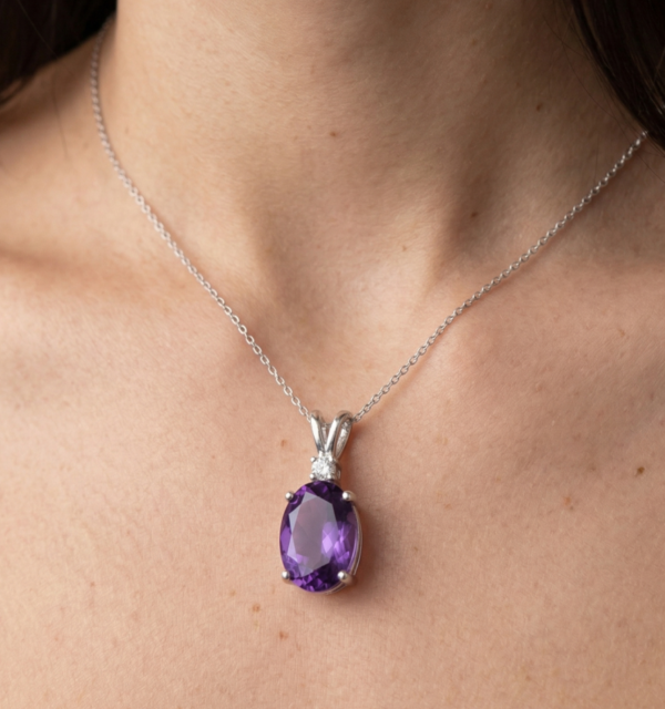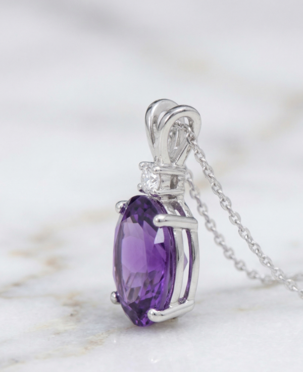 The Amethyst displays a deep, radiant purple hue with beautiful clarity and luster, perfectly complemented by the brilliance of the diamond for a classic and elegant finish.