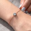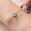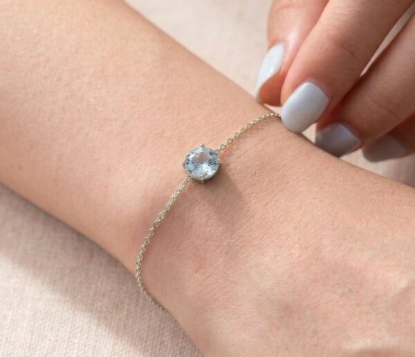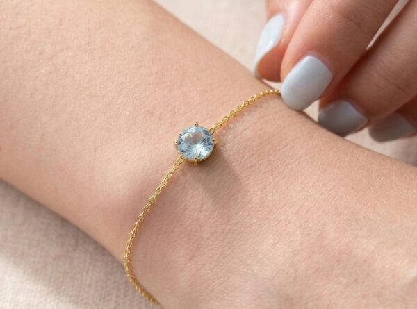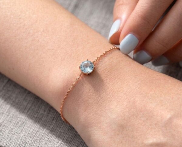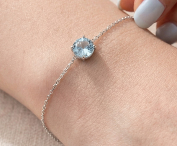 This delicate Aquamarine bracelet features a genuine 5mm round Aquamarine, beautifully prong-set in a secure handmade setting. The natural Brazilian Aquamarine displays a soft, serene blue tone, making it a timeless and elegant piece for everyday wear or special occasions.