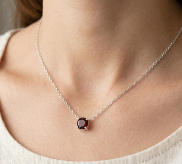 At the center is a 5 mm round faceted garnet (approximately 0.50 carats), displaying rich deep red and burgundy tones. Each stone is carefully selected for its vibrant color and natural brilliance, making every piece unique.