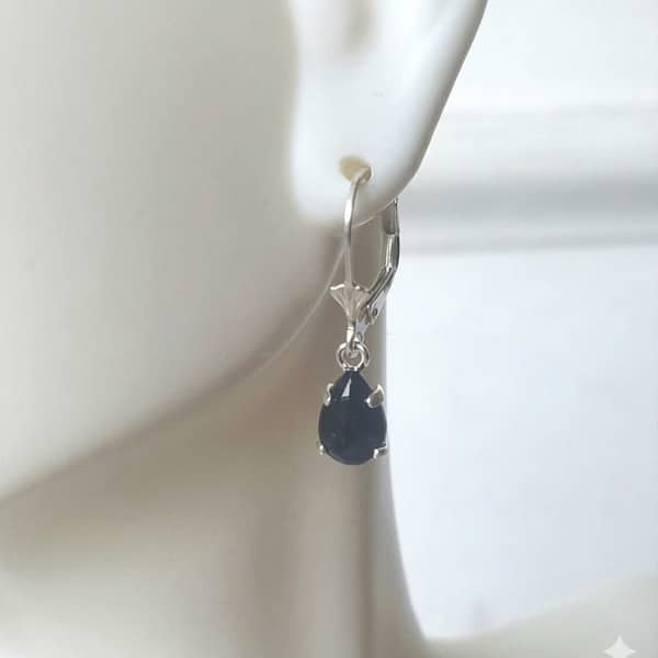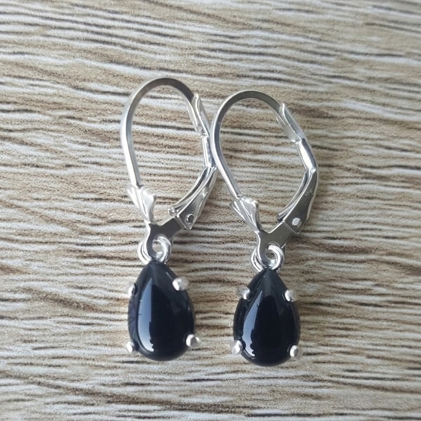 These are genuine Black Onyx teardrop shape earrings set in Sterling Silver or Gold. The prong set is handmade by me and holds the stone in securely.