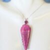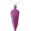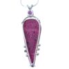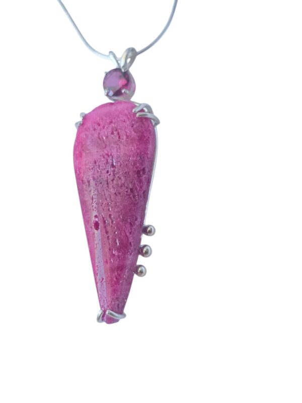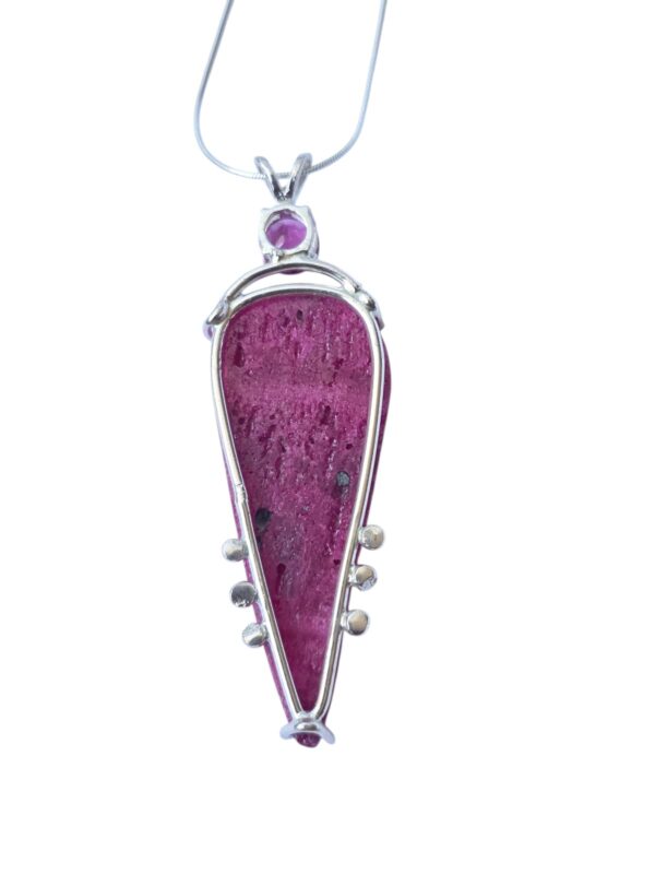The focal point of this piece is a striking natural rock Ruby, cut into a slim inverted teardrop measuring approximately 1.5 inches. Its surface is alive with texture, featuring sparkling druzy pockets scattered throughout the stone. Deep shades of ruby red blend with earthy undertones, giving the piece a bold, organic character that feels both rugged and refined.
