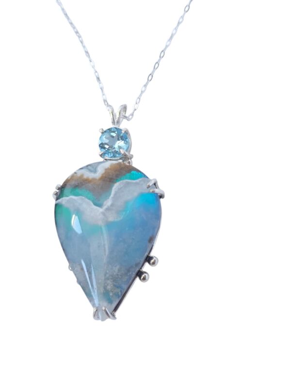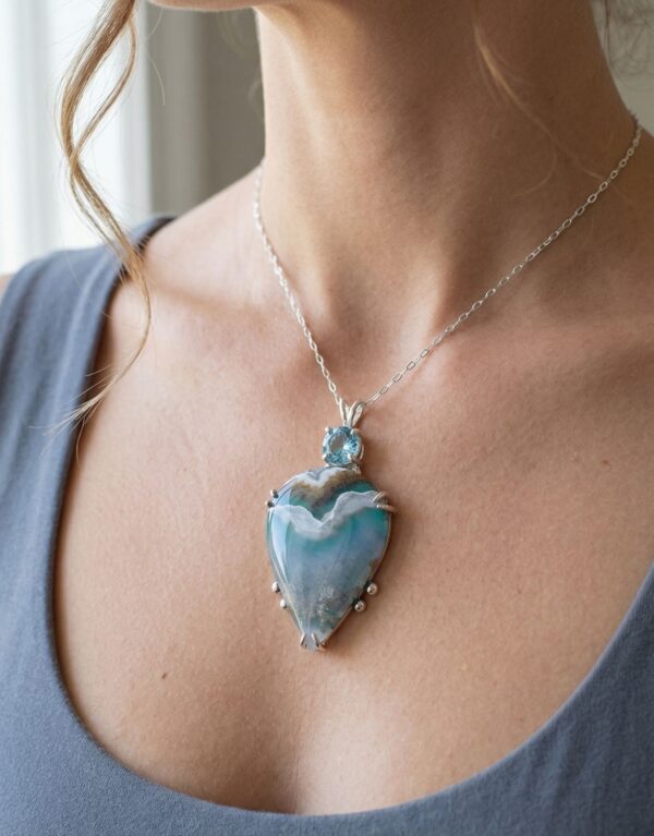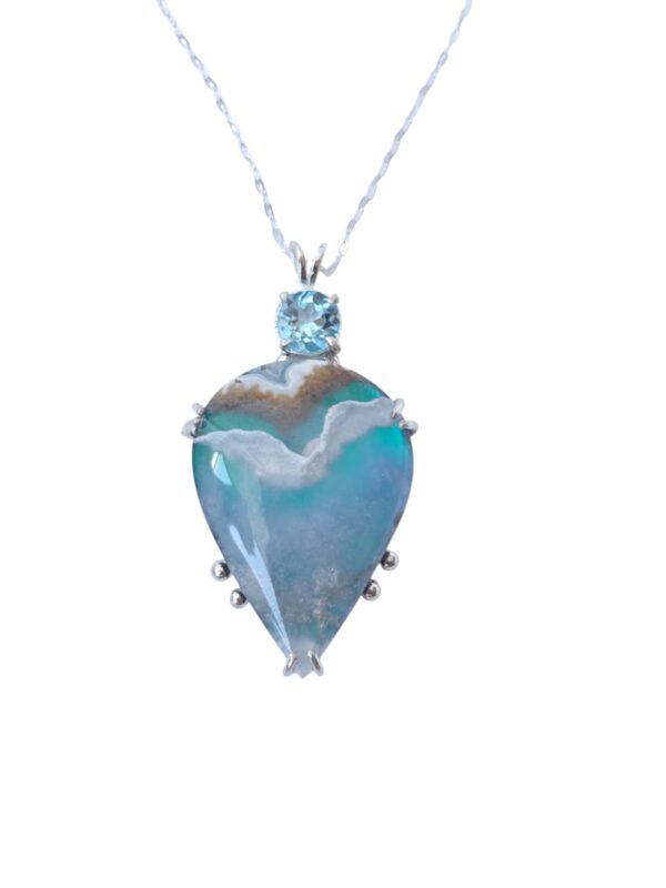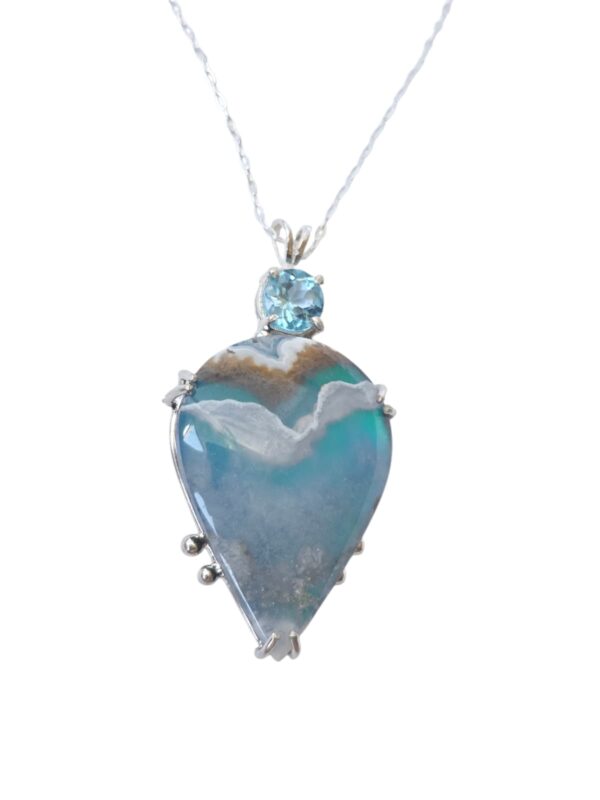 Capture the quiet beauty of sky and sea with this one-of-a-kind handmade Plume Agate and Swiss Blue Topaz necklace, crafted in solid Sterling Silver.