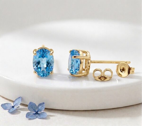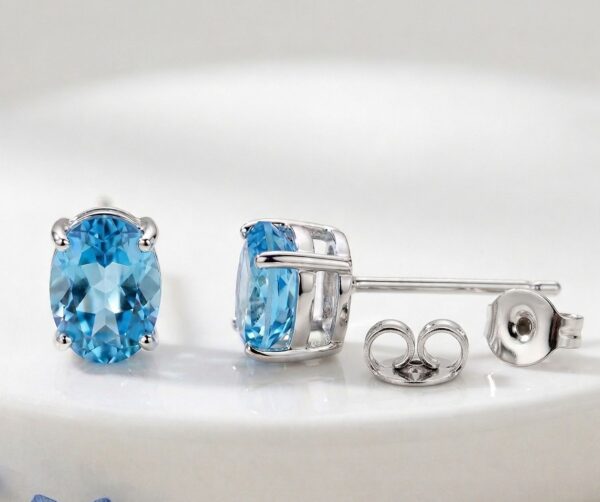 These gorgeous Blue Topaz stud earrings feature genuine oval-cut Blue Topaz gemstones, each measuring approximately 8 x 6 mm. Known for their stunning sky-blue color, these natural gemstones catch the light beautifully, adding a bright, cheerful touch to any outfit.
