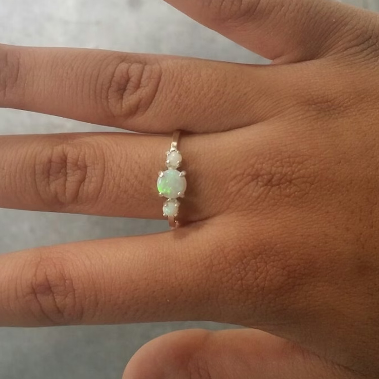 This beautiful Opal ring is a specially crafted 3 stone ring. The stones are genuine white solid natural Opals set in handmade settings specially designed for Opals. The ring shown here is Sterling Silver with an approx. .75 ct genuine 6mm round Opal in the center and two 3mm Opals approx. 0.40 cts, on either side, prong set in handmade settings..